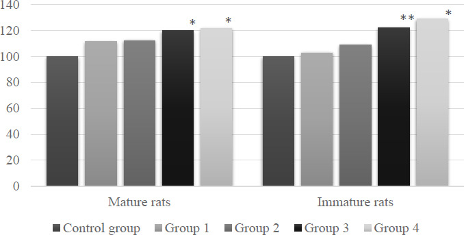 AST activity increased by 20.1% (p<0.05) in white female rats of both age groups that consumed drinking water with a nitrate concentration of 250 mg/l, and with a nitrate amount of 500 mg/l it increased by 21.8% (p <0.05) (Figure 2). In the blood serum of sexually immature rats, AST activity increased in the respective groups by 21.9% (p<0.01) and by 28.8% (p<0.05). In terms of age, the intensity of changes in AST activity in blood serum in sexually immature animals differed little from the indicators of the sexually mature rats.