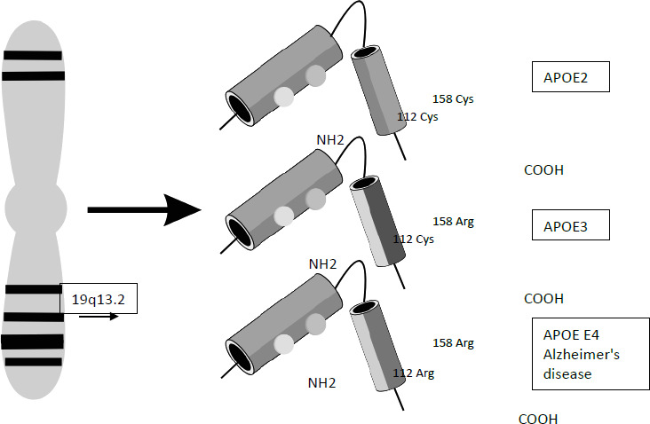 Mutations in the APOE gene, which is responsible for the production of the apolipoprotein E protein – APOE, are one of the factors that increase the risk of Alzheimer’s disease and cardiovascular disorders [6]. The APOE gene is located on the long arm of chromosome 19 q13.2 [7]. It has three isoforms Ɛ2 (APOE ε2) rs28931578, Ɛ3 (APOE ε3) rs121918393, Ɛ4 (APOE ε4) rs7412 or rs429358 [8]. The structure of the isoforms is shown in Figure 1. Individual isoforms are created when amino acids, arginine and cysteine, are present in codons 112 and 158 of the APOE gene [9]. An increased risk of Alzheimer’s disease is observed in the presence of the APOE ε4 isoform [10]. This is related to the impact on the microglia reactivity, abnormal lipid transport and glucose metabolism, as well as reduced synaptic integrity and plasticity. However, the APOE ε2 polymorphism reduces the likelihood of developing Alzheimer’s disease (protective function), despite the development of amyloid β pathology. A difference in the structure of isoforms is the result of non-synonymous mutations, and the consequent changes in the structural and functional properties of the protein [11].