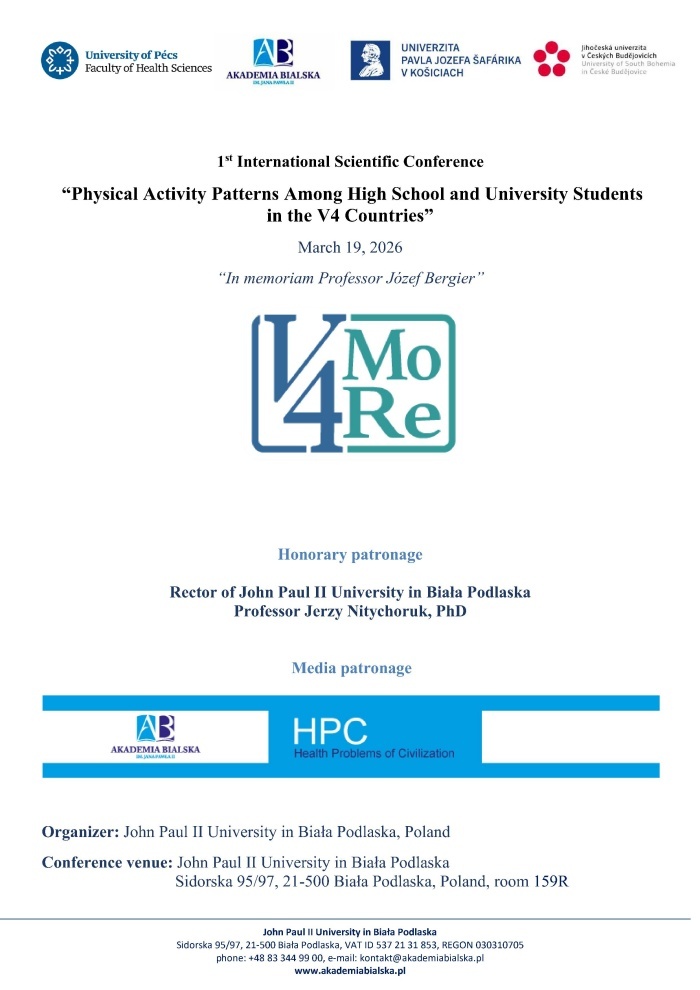On March 19, 2026, John Paul II University in Biala Podlaska will host the 1st International Scientific Conference, entitled "Physical Activity Patterns Among High School and University Students in the V4 Countries," organized as part of a project funded by the International Visegrad Funds (V4).