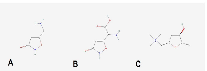 Chemical structure of the most important active substances contained in A. muscaria Notes: A – muscimol, B – ibotenic acid, C – muscarine; own elaboration based on National Center for Biotechnology Information [8].
