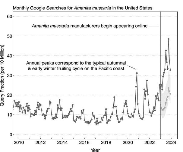 Increase in monthly searches for the term “Amanita muscaria” in Google in the USA over the past years [7]