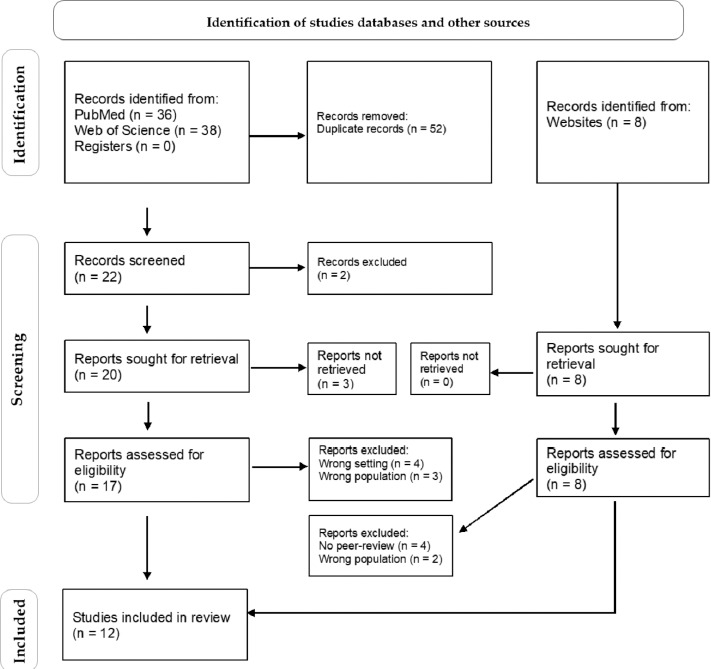 In order to ensure a better transparency of the selection of material from research sources in this systematic review, a PRISMA-based flowchart was introduced in Figure 1. As a result of searching online sources (databases) and applying inclusion and exclusion criteria (date range, topic range, type of references, repetition in English, 12 articles were selected; they were consistent with the aim of the study. A significant number of sources found by the search engine algorithm by using our keywords relate directly to firefighters’ mental health, mental disorders related to professional duties, occupational burnout and the effects of post- traumatic stress disorder (PTSD). The included literature items were divided into 2 groups, viz.: