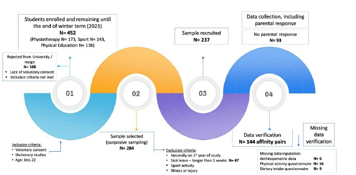 The study design and data collection is presented in Figure 1. Participants included 288 healthy individuals, comprising 46 mother-daughter pairs, 36 mother-son pairs, 33 father-daughter pairs, and 29 father-son pairs. The children were first-year students in the Faculty of Physical Education and Sport and Physiotherapy in 2023 at the Wroclaw University of Health and Sport Sciences. The proportions of males and females represented the true population in these fields of study.