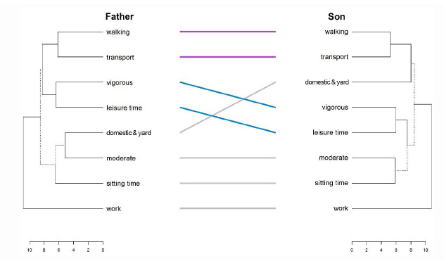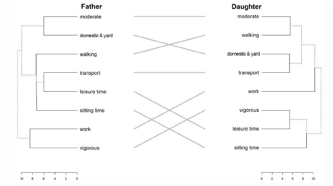 Patterns of PA behavior between parents and children were studied using tanglegrams and cophenetic statistics (derived from a cophylogenetic approach). To assess similarities and conformity/concordance between parent-child patterns, tanglegrams were drawn, and cophenetic statistics were calculated. Distances between variables were characterized by mean, standard deviation, minimum, maximum, and range values. The Mantel test was used to assess correlations between two distance matrices, with p-values calculated. For single dendrograms, Baker’s Gamma correlations (rBG) were calculated [20].