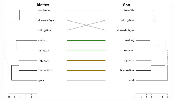 Comparing the tanglegram for mothers and sons (Figure 4), quite similar patterns in PA are observed. Both structures consist of three clusters. Except for the 1st cluster, which contains different items, the 2nd and 3rd clusters are similar, containing walking and transport, vigorous activity in leisure time, and the work domain. This similarity is confirmed by a very low entanglement coefficient of 0.03. The average distances between mothers and sons were 8.38±1.37 and 8.29±1.81, respectively. The high value of the standard deviation indicates more loose links in sons than in mothers. Baker’s Gamma correlation coefficient shows a small and not significant correlation between the trees (rBG=0.26, p=0.166).
