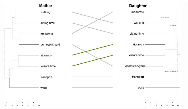 The last comparison is related to the PA patterns of mothers and daughters (Figure 5). The structure of mothers’ PA was more ordered, with two large clusters, each containing four items: the 1st cluster included walking activity and inactivity, as well as moderate activity linked to domestic and yard activities; the 2nd cluster included vigorous activity in leisure time, transport, and work activity. In contrast, the daughters’ structure produced long, chain-like clusters. However, there is a similarity to the mothers in vigorous activity during leisure time. The structures showed medium entanglement with a coefficient of 0.11. The average distances between mothers and daughters were long, measured at 9.53±1.12 and 9.43±1.78, respectively. The similarity between the two trees of hierarchical clustering was low, as confirmed by the small but significant value of Baker’s Gamma (rBG=0.16, p=0.012).