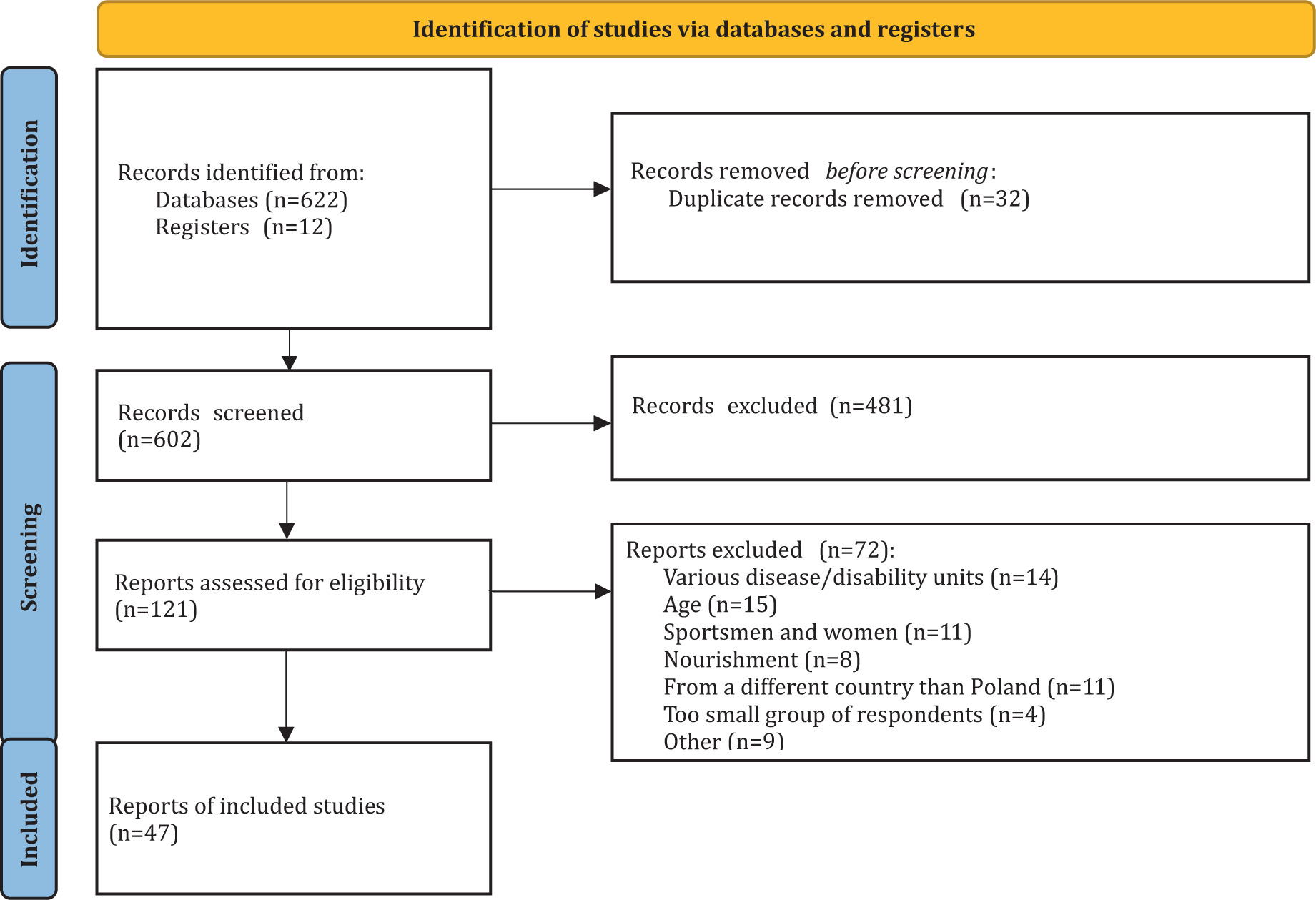 Research articles containing information on PA and SB concerning children and adolescents 6 to 20 years of age from Poland were analyzed. Publications were not included in the analysis if the research concerned Poland but were within international studies in which Poland was not explicitly mentioned. Only studies conducted between January 2000 and December 2022 were included in the analysis. If the publication appeared in the analyzed period, but the research was conducted earlier, the publication was rejected. An allowance was granted specifically for cross-sectional studies carried out across various years. Such publications were not rejected if at least part of the research was conducted in the analyzed period and only that part of the research which was in the analyzed period was included in the analysis. Publications were omitted if they were within the scope of the study and concerned Polish children and adolescents with different disease entities – disabilities. Children and young people from Poland were omitted if their health condition was limited or did not allow them to participate in PA. The analysis did not take into account children and young people from Poland training professionally in any sport discipline. Children and young people who did not attend school and, for example, received their education at home were omitted. Although a link was found between SB and nutrition, these publications were omitted in the analysis, and the focus was on PA in the context of SB. Nutrition is an integral part of a healthy lifestyle, but to include it would have taken it outside the scope of the analysis and reduced its effectiveness in relation to PA in the context of SB. The minimum number of study participants included in the analysis was 50.